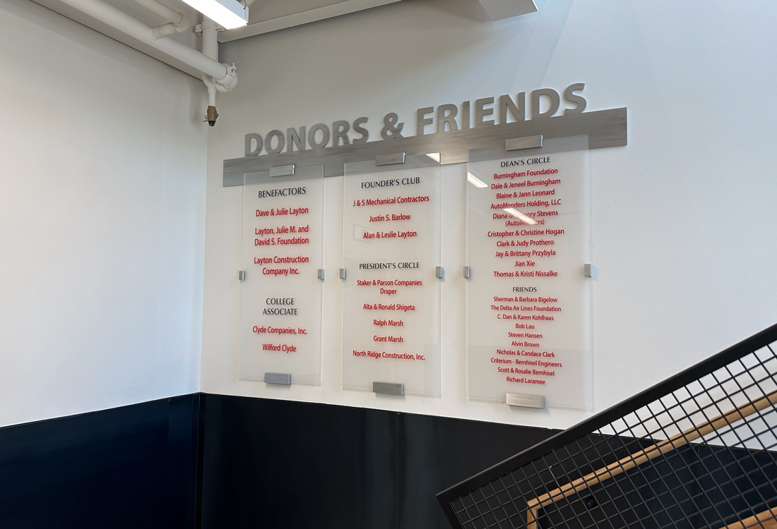 Stippich Design was provided initial concepts developed by the design team for the John and Marcia Price College of Engineering for the Alan W. Layton feature recognition wall and donor plaques. The design phase focused on refining designs for the Alan W. Layton feature wall and donor recognition plaques to match priorities for scale, materials and messaging and to adapt donor recognition wall design developed by Stippich Design for the Meldrum Innovation Lab to the Layton Engineering Building’s color palette. This was accomplished by Stippich design providing photo realistic renderings, detail drawings for the Alan W Layton wall and all of the component pieces, detail drawings for each individual donor plaque, detail drawings for the donor recognition wall and leading meetings to review overall designs, messages on each donor recognition item, materials and gather feedback to reach finalized design solutions.